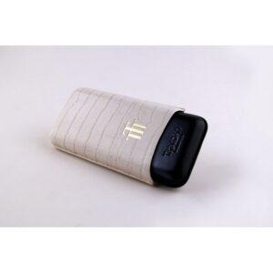 Purera de piel para 3 puros de color negra con impresión de cuadros en color plata representativos de la marca Cohiba. Cepo máximo 57, longitud máxima 192 mm.
